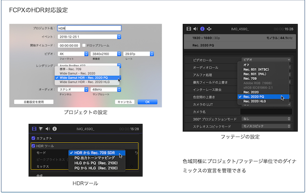 FCPXはVer10.4(2017.10)からHDRに対応しており、PQ、HLGに対応している。そして色域と同じようにスマートなマネジメントが用意されておりSDRを含めての混在も容易だ。