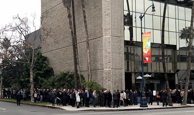 アカデミーの建物を取り囲む、入場を待つ「一般人」の長~い列。VFXスタジオ等に勤務する業界関係者が殆どだ