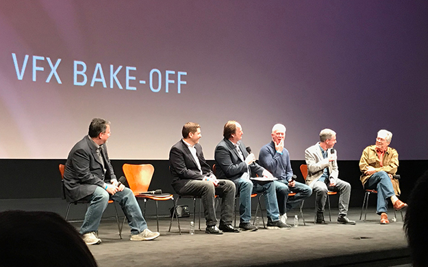 場内を見渡すと、業界のレジェンドと呼ばれる人々の姿が目につく。1977年の「スター・ウォーズ」で、伝説のオープニング・スクロールやミレニアム・ファルコン号を撮影し、「特撮の神様」と呼ばれたリチャード・エドランドがいる。ILMのVFXスーパーバイザーで映画「ローグ・ワン/スター・ウォーズ・ストーリー」の原案を書いたジョン・ノール(Photoshopの生みの親としても有名)がにこやかに談笑している。そして、雑誌やネット記事などで顔写真を目にした事がある、世界中のVFXスタジオ各社の著名スーパーバイザー達が、この日のプレゼンを行うために訪れている。そう、このベイクオフは、ハリウッドのVFX業界の首脳陣が、一挙集結する試写会&イベントなのである。