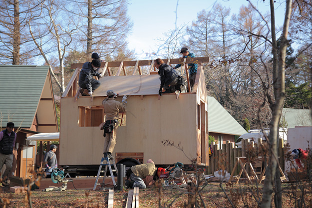 ワークショップは、山中湖の近くのキャンプ場で開催され、参加メンバーが2週間に一度集まりながら、約3ヶ月で1棟のタイニーハウスを作るというもの。参加メンバーには、建築士もいれば、主婦の方やイラストレーター、学生など、個性的で面白い人ばかりで、毎回撮影がとても楽しかった。
