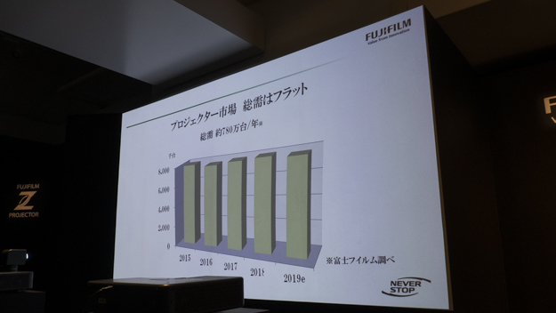 飯田氏は「富士フイルムはなぜプロジェクター市場に参入したのか?」その理由を紹介した。プロジェクター市場の台数はここ数年、約780万台から800万台でほぼ横ばいの状態。「なぜプロジェクター市場が伸びていないのか?答えは新たな設置や用途でプロジェクターが広がっていないから」と語る。
