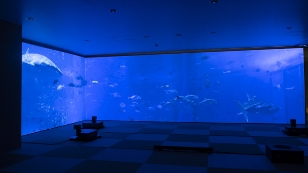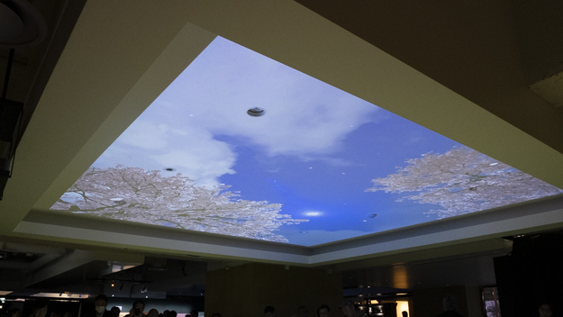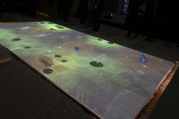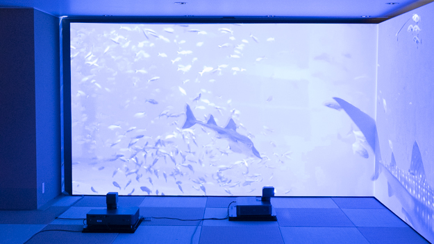 上下一台ずつの合計2台のFP-Z5000で投写を行った空間のデモ。プロジェクターから投写しているとはすぐに分からないだろう
