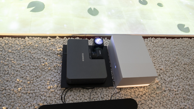 展示スペースでは、FP-Z5000の実演展示が行われた。デモコーナーでは、レンズシフト機能や回転レンズを活用した5種類の投写を実演。そのうちの1つが、天井投影/床投影で、上下一台ずつ合計2台のFP-Z5000で天地の高さ2.5mの空間に約300インチ相当の巨大プロジェクションの投写を行った。