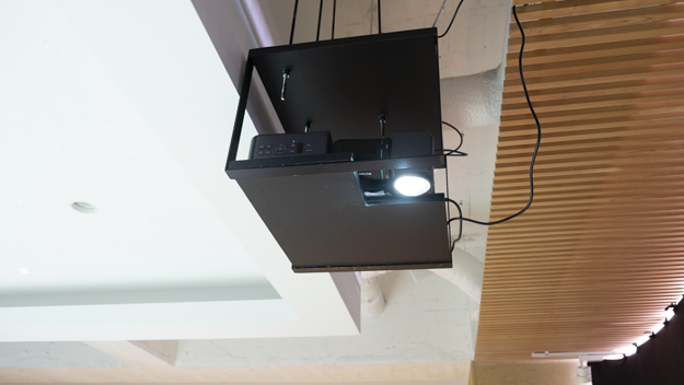 これまでは床にプロジェクターを向けるのも困難だった。FP-Z5000はレンズの向きを自由に変えられるため、天吊りにも対応しやすい。今後、天吊り金具も周辺アクセサリーとして準備されるという