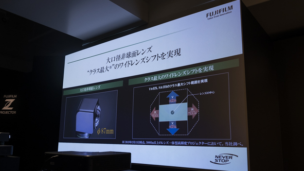 特に「歪みのない大画面は富士フイルムだから実現できた」と強調。屈曲型二軸回転機構と呼ばれるレンズには、20枚以上のレンズを使用し、その開発には富士フイルム独自開発の光学設計ソフトによって高度なレンズ設計が行われているという。さらに、最前面のレンズには、超短焦点と大幅なレンズシフト機能を実現するための複雑な大口径球面・非球面レンズを採用している。