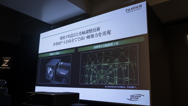 20枚以上のレンズと回転機構の搭載となると、性能を出すための光学調整も相当困難であることが予想される。工場では、6方向への投写と大幅なレンズシフト機能、高い解像を実現するために、高さ約3mのチャートを投写して、職人が1点、1点光軸を合わせて組み立てられているという。「富士フイルムには、6方向どの向きにレンズシフト機能を行っても高い解像を実現できる光軸調整技術がある」と胸を張る。