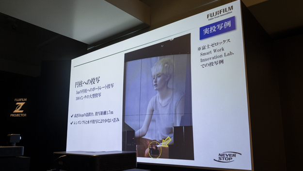 会場デモ以外の事例紹介も行われた。横浜のみなとみらいにある富士ゼロックスのSmart Work Innovation labには直径5メートルの円柱があり、そこに300インチの投写を実現したという。通常のプロジェクターで投写を実現するのは、プロジェクターを高い位置に設置しなければいけない。FP-Z5000は、床から約50センチ、高さ1.7mの距離から300インチの投写できたとのこと。