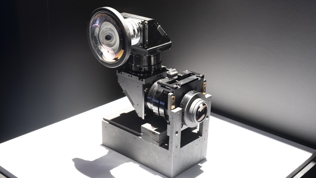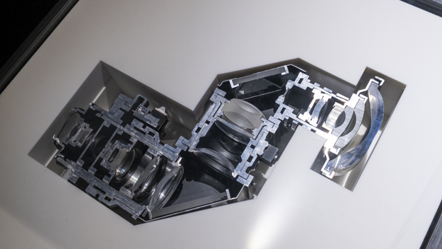 二軸回転機構レンズのカットモデル。独自開発のソフトウェアによる精密な設計により、大口径屈曲式レンズを実現