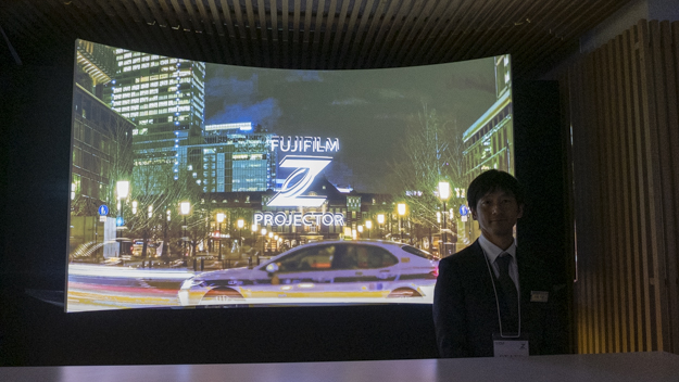 富士フイルムは2月13日、東京都内にてプロジェクターの新製品発表会を行った。発表されたのは、屈曲型二軸回転機構レンズを搭載した富士フイルム初の超短焦点プロジェクター「FUJIFILM PROJECTOR Z5000」(以下:FP-Z5000)。本体を動かさずにさまざまな方向への投写や75cmの至近距離から100インチの迫力のある大画面映像を映し出せる特徴があり、発表会内では効果的な投写方法を実演デモも行われた。