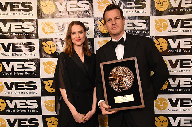 VESビジョナリー賞を受賞したジョナサン・ノーラン(右)。左は賞のプレゼンターを務めた女優のエヴァン・レイチェル・ウッド(画像提供:VES)