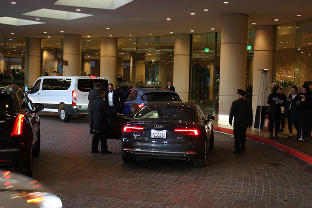 ビバリー・ヒルトンに続々と到着するリムジンや高級車。写真では見えないが、エントランス右側奥にはノミネートされた方が入場するレッド・カーペットが用意されている(筆者撮影)