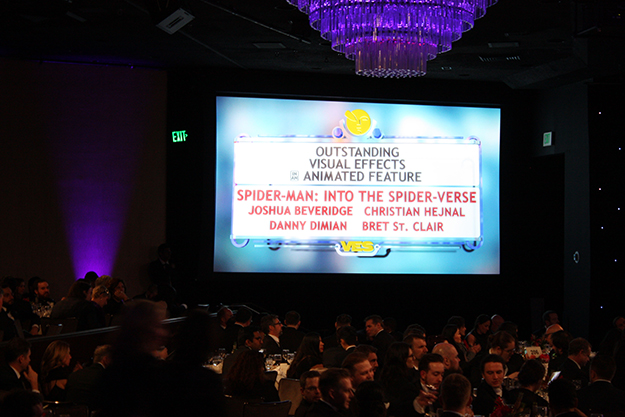 発表の瞬間。巨大モニターには受賞作品の名前が表示される。「スパイダーマン:スパイダーバース」はアニメ関連賞で圧倒的な強さを見せつけていた(筆者撮影)