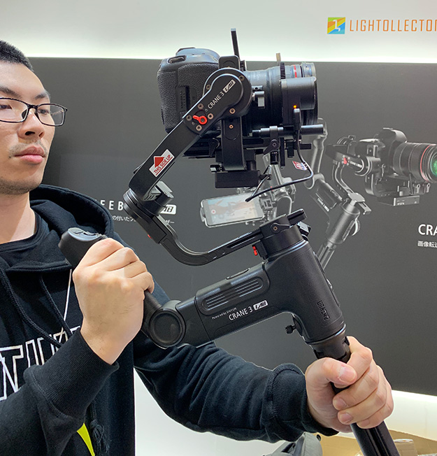 完全に動画のプロダクトのCRANE 3 LAB。ハンドルグリップが特徴的だがスマホでもコントロールできるようになっている。この辺りは一般のユーザーにも導入しやすくしているのだと感じた。ここでも一眼レフの動画ユーザーを意識した展示になっていた。