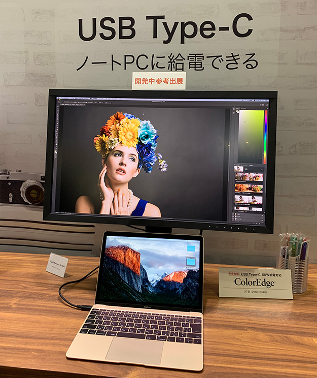 面白いなと思ったのがEIZOのブースにあった参考出展のモニター。Type-C接続一本でつながるほか、60Wの供給がができるのでノートパソコンユーザーには望まれていたガジェットといえる。60W位あればと思っていたが出たらすぐに試してみたい。画像加工でなくても動画編集で使いたいガジェットなのは間違いない。