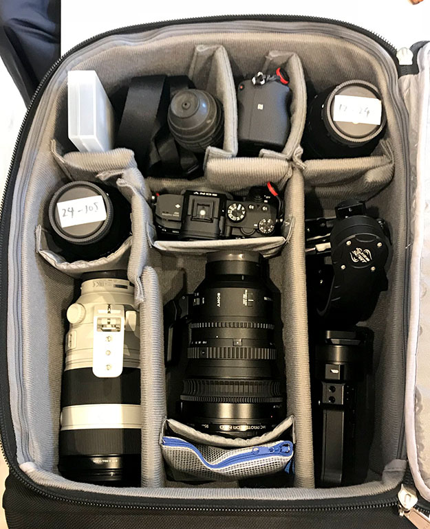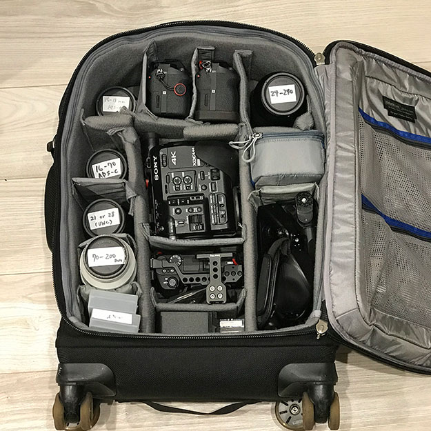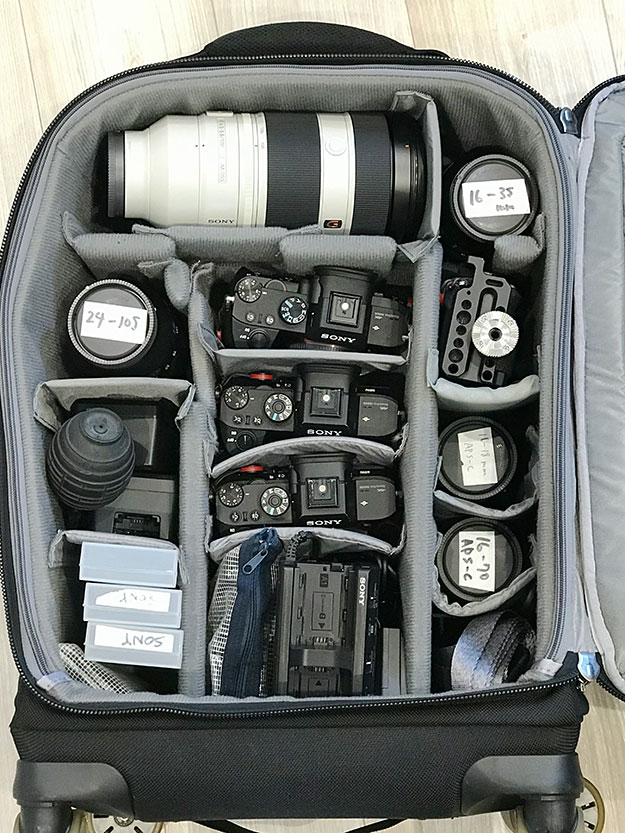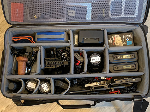 Airport Roller Derby収納例。カメラ2台、レンズ9本、ジンバル、マイク、予備バッテリーまで入ってしまう