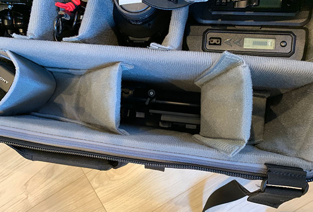 (1)まずRONIN-Sを最低限バラしてみる。バッテリーにもなっているグリップ部分と三脚を外し、バッグのセパレーターに自然に合う形で合わせてみる。窪みがあるセパレーターのおかげでぴったり合わせる事ができた。