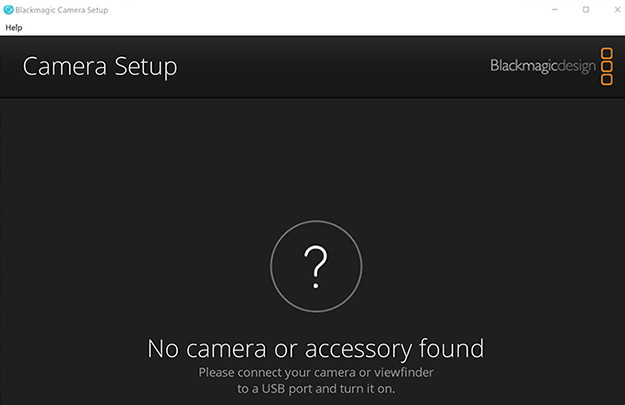 Blackmagic Camera Setupを立ち上げ、BMPCC4KをUSB2.0ケーブルで接続しよう。カメラ電源を入れてしばらくしてもこの画面のままカメラを認識しない場合、USBケーブルを2.0ケーブルに変えるか、Thunderbolt 3ポートを使ってファームアップしてみよう