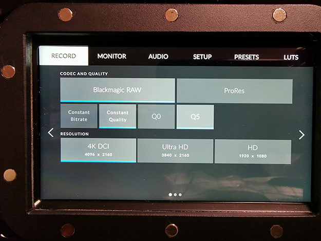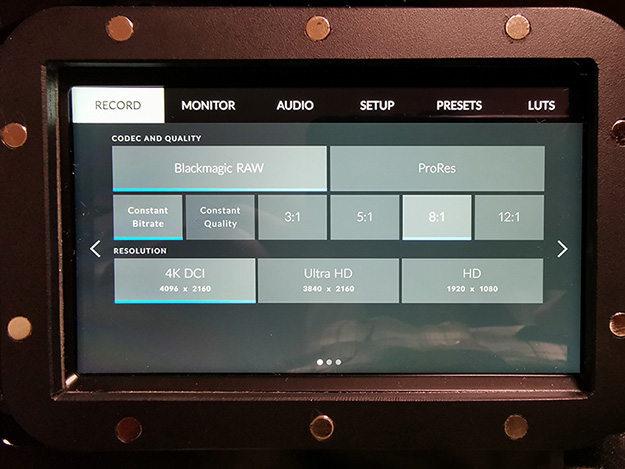 ファームアップが上手く行ったら、次はいよいよ収録の設定だ。さっそく、メニュー画面から「RECORD」メニューを見てみよう。大きく「Blackmagic RAW」と「ProRes」の二つにメニューが分かれているのがわかる(Cinema DNG形式は消えてしまった)。