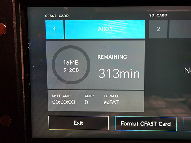 Q5でレンズキャップをしたままだと512GBのCFast2.0で313分の収録時間が示されるが、もちろんデタラメである
