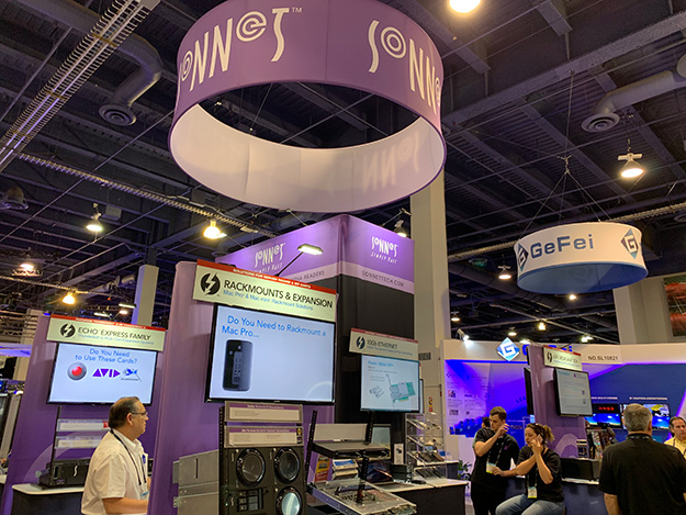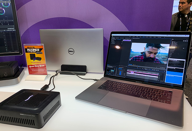 このブースでは外付けのeGPUのモデルなどを紹介していたが、Premiere Proを使ってデモンストレーションを行っていた。直接Thunderbolt 3で接続すればドライバー不要で利用できるeGPUが動いていたが非常に気になったのはGPUの使用状況。デモでは複数枚のGPUが動いていた。私自身はずっとシングルGPUだと思っていたのでこれには驚いた。外付けと内蔵のGPUを両方稼働させていたし、eGPUは複数枚繋げても動いていた(今回のデモではeGPUx2だったので内蔵と合わせて3枚のGPUが稼働)。これによってより快適な構成が組めそうだった。