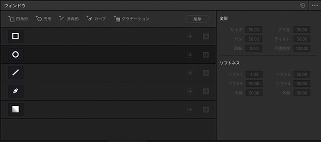 ウィンドウ・パネルを開くと5種類のウィンドウツールが並んでいる。上から「四角形」「円形」「多角形」「カーブ」「グラデーション」の5種類だ(図01_01)。