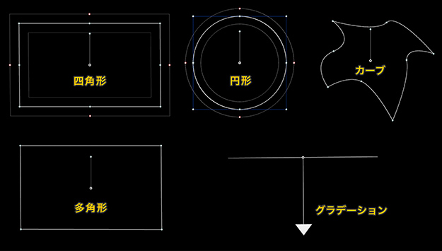 下図(図01_02)は各ツールのインターフェイス。太い実線に配置されている白丸ポイントをドラッグして変形させ、対象を囲っていく。四角形と円形にはデフォルトで、適度なソフトネス(細い実線の範囲)、いわゆるボカシがかかっている。