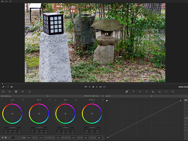 曇天という光にメリハリのない日中に、ズームレンズのワイド側を使って、アイリスも絞り気味に撮影されている。そのため、左手前の白っぽいグレーの灯籠も明るく、しかもシャープに映ってしまうので、視聴者の視線がそちらに誘導されてしまう。これをウィンドウを使って要望に沿うようセカンダリー調整していこう。