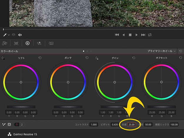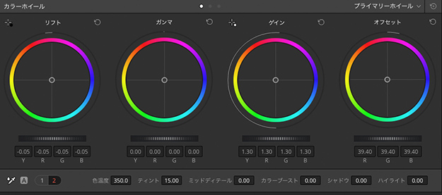 (1)最初に基本的な色調&コントラストを調整する。最初の“01ノード”に、プライマリーホイールを使って基本的な調整を施す。「オフセット」で全体の輝度を少し上げた後、「リフト」と「ゲイン」を調整してコントラストを拡張し、画像全体のメリハリをつける。