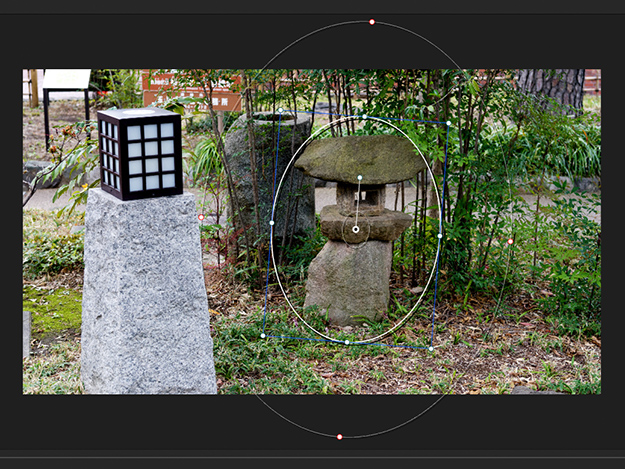 ウィンドウ・パネルの円形ツールをアクティブにすると、画像中央に円形ウィンドウが表示されるので、中央付近をつかんで(クリックして)、対象の石灯籠上を囲むように配置する。