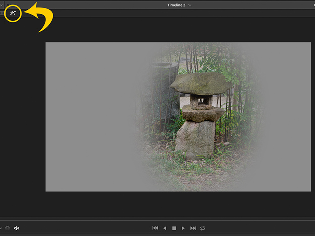 (5)ここで、楕円形からどのくらいのソフトネスがかかっているのかを確認してみる。ビューア左上のハイライト・アイコンをクリックする(オンにする)と、対象の石灯籠から徐々にグレーにグラデーションしている、すなわちソフトネスがかかっていることが確認できる(図02_05)。