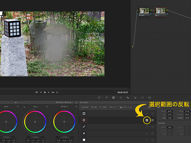 (3)シリアルノードを追加し、ウィンドウ・パネルを開く。クライアントの意向は中央の石灯籠を自然に目立たせることなので、レンズのビネット効果のように周囲を暗く落とすことにする。今回は、円形ウィンドウを使った。