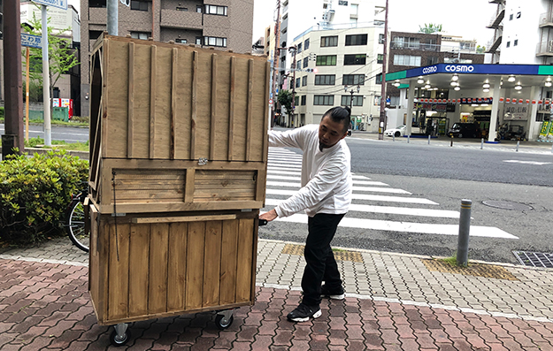 よく目にするリヤカーに乗っている屋台は新品で約60万円で販売されている。しかも保管に自動車一台分のスペースが必要だ。飲食をやるのが目的なら必要だが配信用には少し値が張るし、大きすぎる。「保管場所は事務所」「事務所のビルのエレベーターに乗る」「一人でも移動させられる」という条件が必須になる。