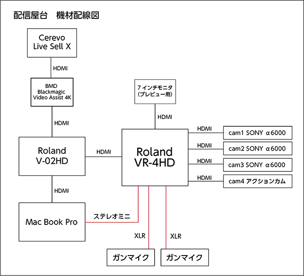 配信屋台の機材は配信コミュニティースペース「ヒマスタ」を運営されている株式会社ヒマナイヌ川井さんのブログなどを参考に選定した。湯気越しの人物をボケ感たっぷりで撮りたかったのでカメラは大判センサーのものをと思い、センサーがAPS-Cサイズのソニーのα6000を3台購入した。