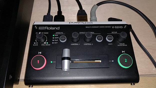 カメラスイッチングの他にPCの画面を配信にのせるシチュエーションも考えられるのでVR-4HDのアウトとPCのアウトをスイッチングできるようにもう1台スイッチャーとしてRoland V-02HDを用意した。