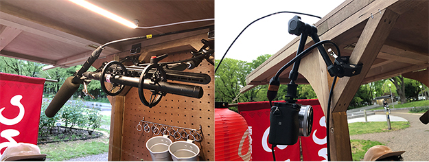 カメラやマイクの設置の際、三脚やマイクブームを使わずに屋台自体に設置したいというこだわりがあった。レトロな屋台にデジタル機器が仕込まれている様は和風スチームパンク感がある。屋根や柱が出演者に近いのでガンマイクをかなり近い距離で仕込めたりと、理にかなっているセッティング方法だ。