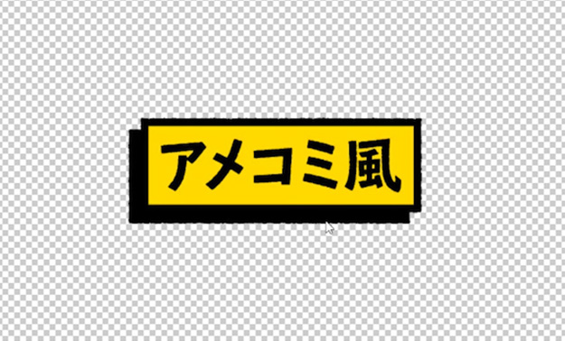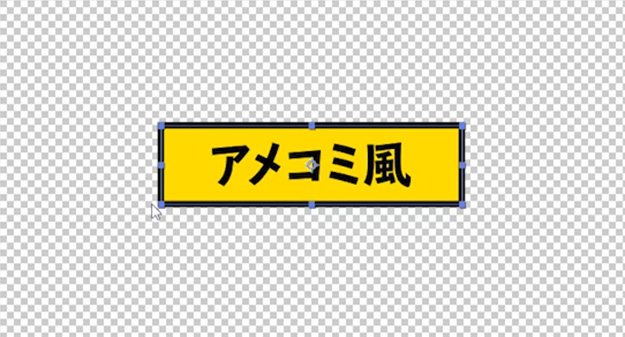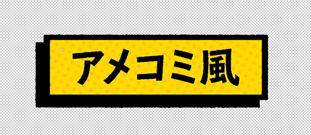 新規の長方形ツールで適当な四角を作ります。塗りは黄色で線は黒の15pxにしておきます。その中に任意の文字を入れ込みます。今回は「アメコミ風」としておきました。ちなみにフォントはAdobeTypekitにある「TBカリグラゴシック」です。