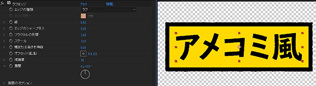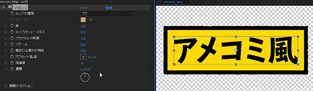 テキストレイヤーにもエフェクトの「ラフエッジ」を追加し以下の数値に設定します。