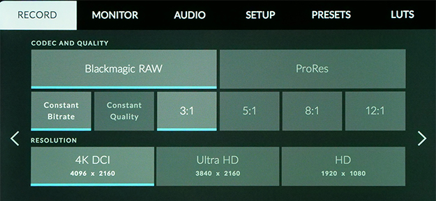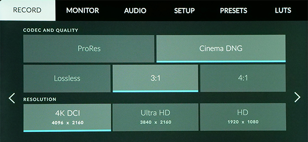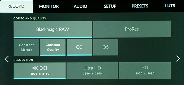 実際、Blackmagic DesignのWEBサイトにおいても、推奨SSDリストの中に「4K DCI Lossless RAW up to 60fps」という項目は存在していない。フォーマット画面では選択可能であり、収録時も特に警告表示も出ないのだが、事実上は外部SSDでの収録は不可能なので注意が必要だ。
