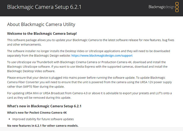 さて、BMPCC 4KをBlackmagic RAWに対応させるには、カメラ本体のアップデートが必要だ。5月上旬現在、BMPCC 4Kに関連した最新のアップデートは“Blackmagic Camera 6.2.1”になる。なお、Blackmagic RAWへの対応は6.2からだ。