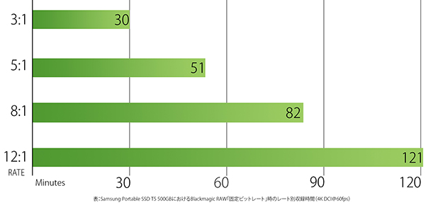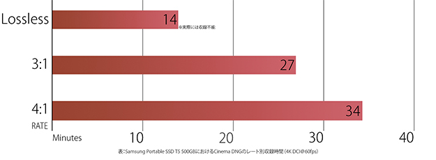 次に参考値として、CinemaDNGによる収録時間を示す。セッティングは、4K DCI 60fpsとした。