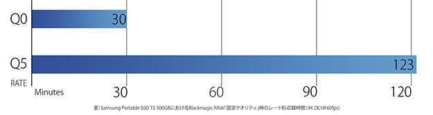 なお、フレームレートを半分にした4K DCI 30fpsのセッティングの場合は、Q0=61分、Q5=245分という結果であり、単純に60fpsの倍の時間が収録できると考えて良い。