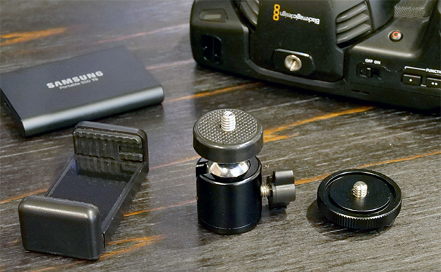 それでは、Samsung Portable SSD T5にBlackmagic RAWを収録してみる。今回は、Samsung Portable SSD T5とBMPCC 4Kの組み合わせですぐに使える「Samsung Portable SSD T5 & Blackmagic Pocket Cinema Camera 4K取付キット」もお借りした。こちらのキットは、SSDのほかに、T5用ホルダー・ボールヘッド・オス-オス止めネジを同梱している。既存品の組み合わせの様なセットなので、自分で買い集めることもできるようなアイテムばかりだが、一通り揃っているので導入には持って来いだろう。
