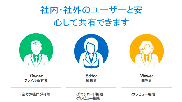 また、放送業界の場合は、「社内に共有したい」「グループ会社と共有したい」「スポットでたまにしかやらない人と共有したい」「一回だけ見せたい」という多数の共有機能が必要になる。しかし、Googleドライブだけでもアップロードしたものを共有できるが、共有する方法の種類は微妙に少ない。外部に対しても、全員同じ権限で共有することは、あまり望ましくないだろう。