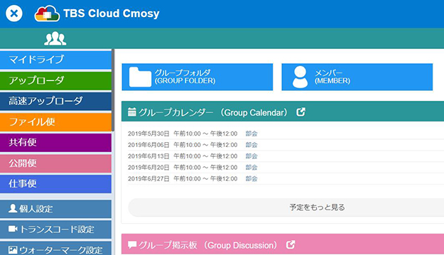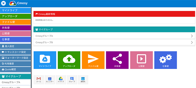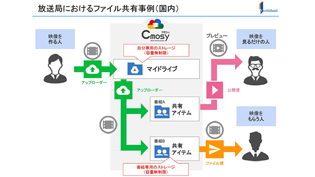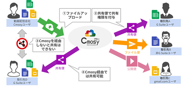 Cmosyには、大容量ファイルを渡す「ファイル便」、更新権も与える「共有便」、閲覧権限を付与したものだけ観られる「公開便」のサービスがあり、他のWebサービスを使う必要をなくしている。また、そのファイル便や共有便、公開便で微妙に共有権限が異なっており、相手に応じて共有方法を変更することができる。例えば、ユーザ・グループ単位で編集者、閲覧者権限を設定することも可能だという。