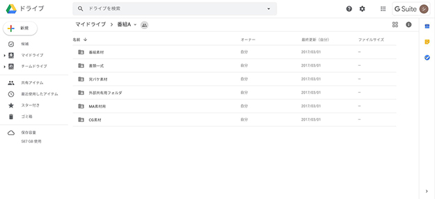 例えばドラマ撮影の場合は、1つのシーンの撮影の尺は約10分で、ファイル容量は10GB、30GBなどになります。1TBまではいきませんが、こういった大容量ファイルを制限なく使えます。社内で使っているGoogleドライブの総容量は現在約600TBで、1日に約1TBずつ増えています。そういった容量をG Suite BusinessプランのGoogleドライブならば日常的に扱うことができます。