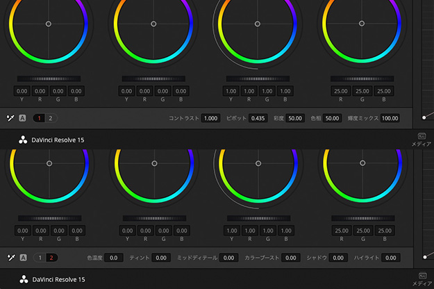 左から「ホワイトバランス」と「自動バランス」、そしてページ選択ボタン。1ページ目は「コントラスト」「ピボット」「彩度」「色相」「輝度ミックス」、2ページ目には「色温度」「ティント」「ミッドディテール」「カラーブースト」「シャドウ」「ハイライト」といった調整ツールが配置されている(図01-01)。