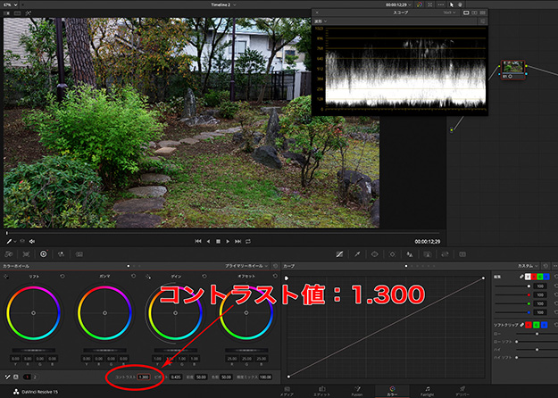 (03)ビデオスコープをオン(Shift+Command+W(Mac)/Shift+Ctrl+W(Win))にして波形モニターを観察しながら、コントラストの数値を上げて(増やして)みる。