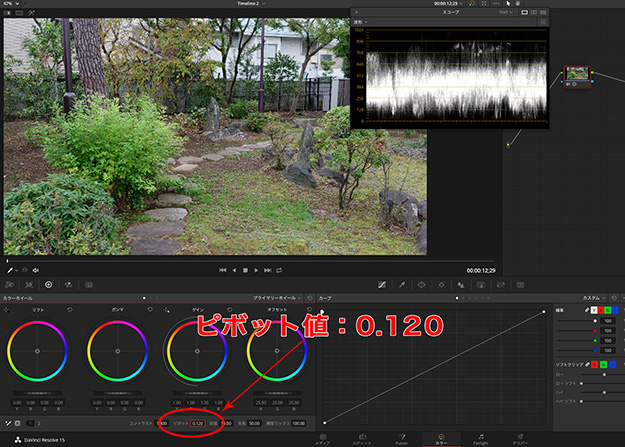 画像と波形モニターを確認しながら、ピボットの数値を少しづつ下げていくと、画像が明るくなり、波形モニターも徐々に上に持ち上がっていくのが分かるだろう。
