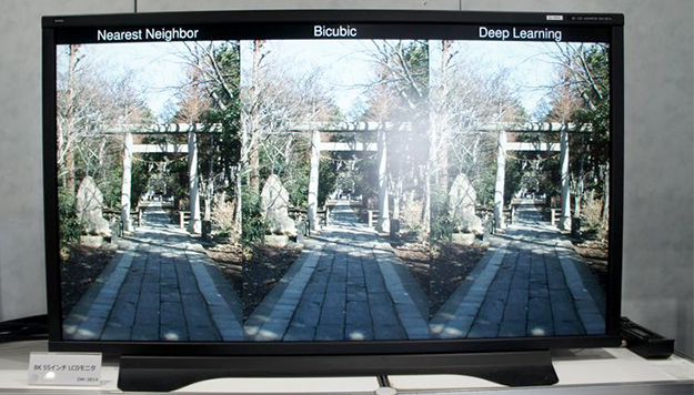 ディープラーニングによるFHDからUHDへの変換と通常の返還時の画質比較。ニューラルネットにより高速処理と高画質を両立