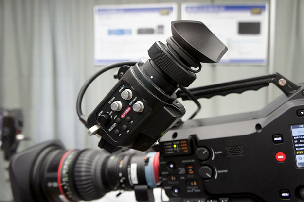 8C-B60A専用ビュアーファインダーDF-3516。1920×1080のフルHD解像度の高応答有機ELパネルを採用しており、60i、24sF、50iなど多様な映像フォーマットに対応したマルチフォーマットビューファインダーで、拡大、マーカー、ピーキングなど、カメラの焦点合わせ機能や波形表示機能などを搭載している